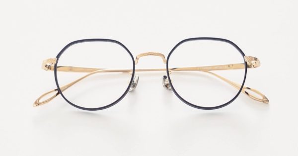 チタン製ならではの軽い仕上がりのクラウンパント型フレーム。ブリッジや智、テンプルの繊細な紋様が目を惹く。リムはワイヤーを重ねたようなデザインで厚みがあり、サイドから見て印象的なだけでなく、強度数のレンズを入れても目立ちにくい実用性を伴う。