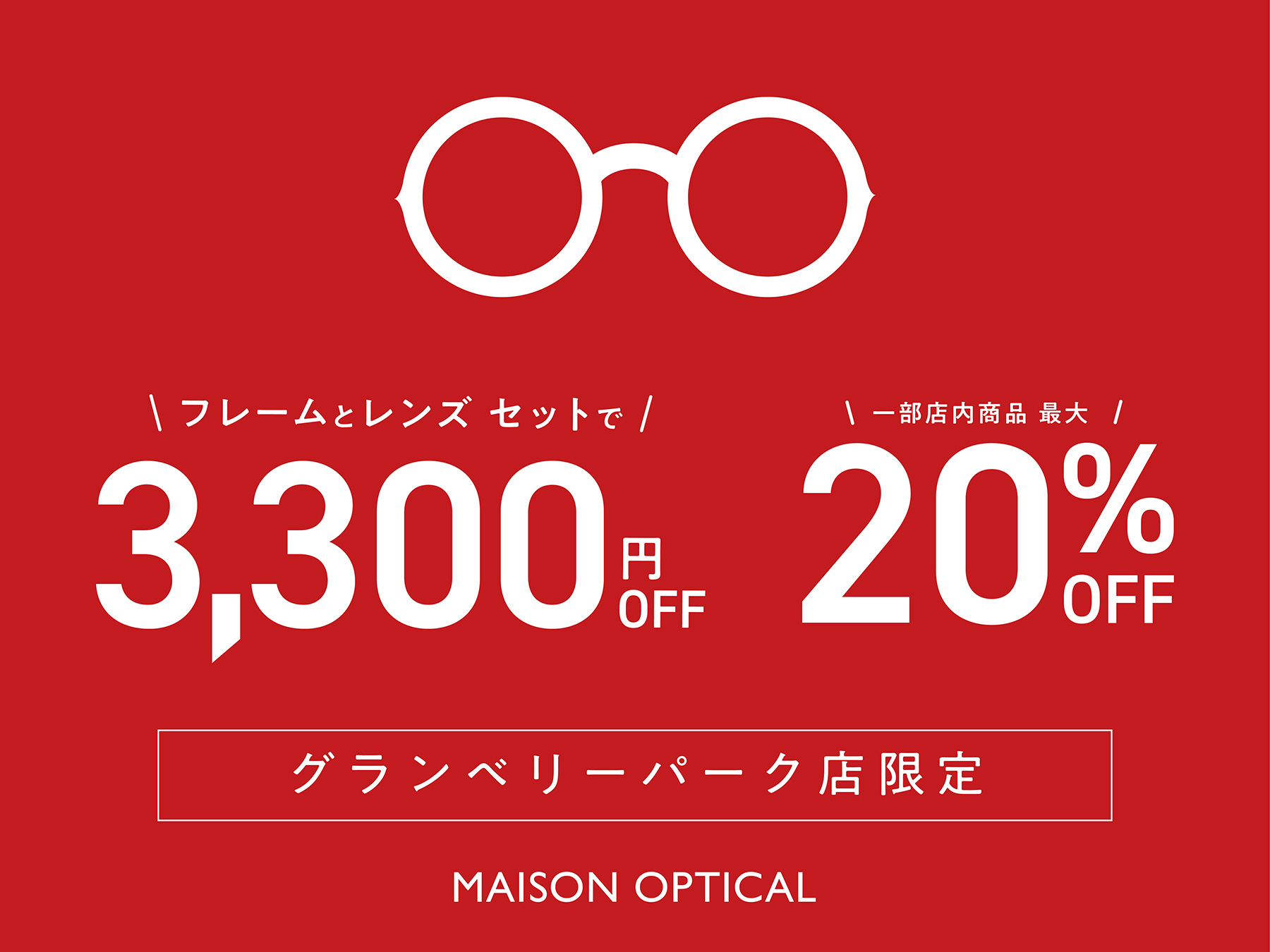 現在、フレームとレンズセットで3,300円OFF(税込)、さらに一部店内商品最大20%OFFキャンペーン開催中。