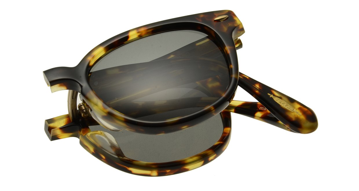 折りたたみ(フォールディング)サングラスSheldrake-FLSG。アンディ・ウォーホールのアイコニックなスタイルにインスパイアされ生まれたデザインで、1960年代?70年代のデザインをそのまま掘り起こしたようなオーセンティックな雰囲気が多くの支持を集めています。テンプル折り畳み部分にはかしめ製法を採用し、新たにオリジナル丁番を製作するなど細部にまでこだわっています。